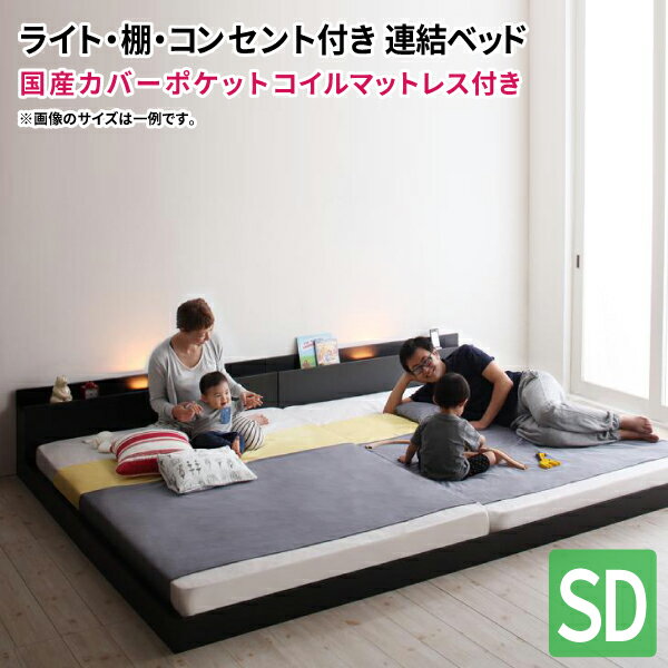 ローデザイン 連結ベッド 2台 ワイドK210(セミシングル×セミダブル) ロング丈 国産ポケットコイルマットレス付き 長い ロング 分割ベッド 日本製 国産 ベッド2台 ローデザイン ロータイプ 低いベッド コンセント付き 棚付き 照明付き ライト付き 新婚 家族 親子ベッド