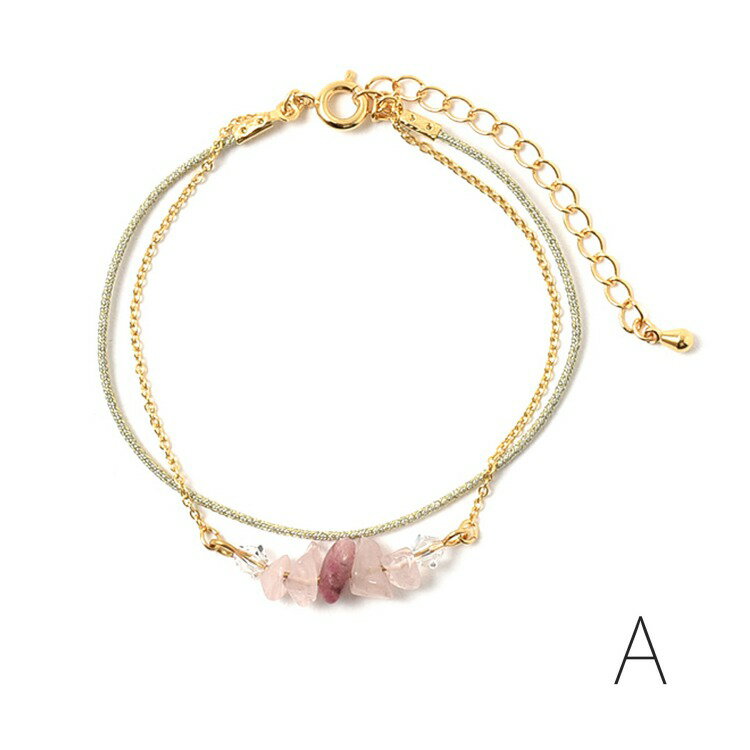 商品情報 サイズ 手首まわり約14〜19cm 素材 A ポリエステル70%、ステンレス糸7%、レーヨン23% 真鍮、天然石(淡ローズクウォーツ、濃ピンクトルマリン)、スワロフスキー・クリスタル B ポリエステル70%、ステンレス糸7%、レーヨン23% 真鍮、天然石(淡ブルーレース、濃ソーダライト)、スワロフスキー・クリスタル C ポリエステル70%、ステンレス糸7%、レーヨン23% 真鍮、天然石(淡ムーンストーン、濃ハウライト)、スワロフスキー・クリスタル お願い ※本製品は静電気を完全に除去するものではありません。